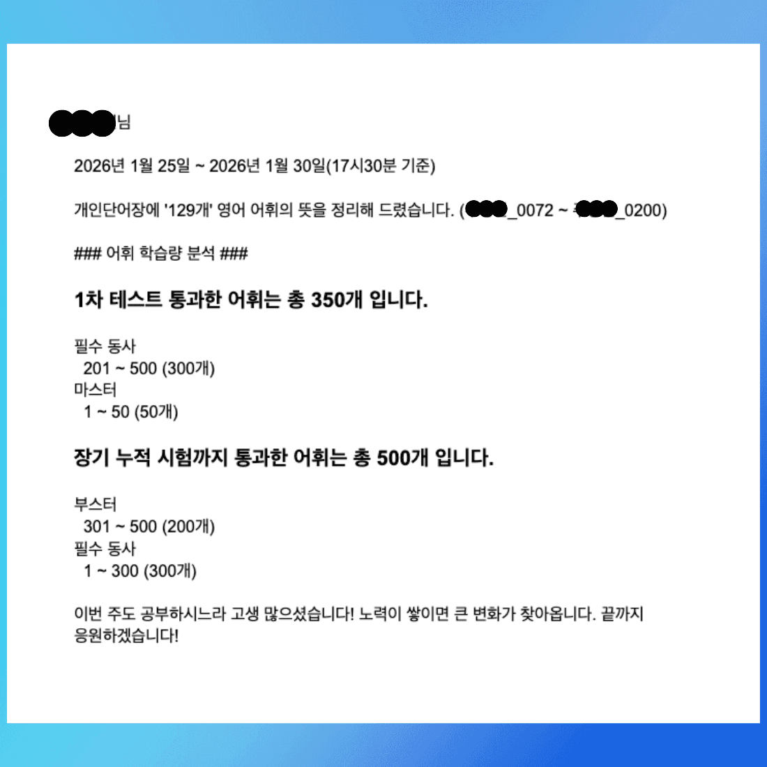 매주 학생별 개인 누적 단어장에 학습 단어가 자동 정리되고 테스트 통과·누적 통과 현황이 리포트로 제공됩니다.